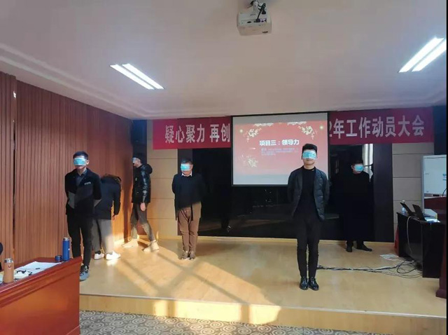 参加训练的人员需要戴上眼罩,打乱顺序,然后听队长指挥站到指定位置上,如果不听指挥放任自己的个性在绝对看不见的情况下完成任务是极难的,7个小组按照要求出色完成了站位。