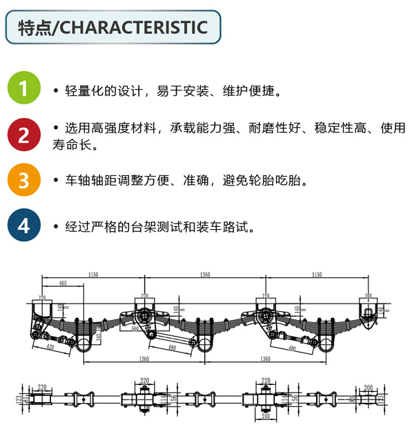 车轴轴距调整方便、准确,避免轮胎吃胎; 经过严格的台架测试和装车路试